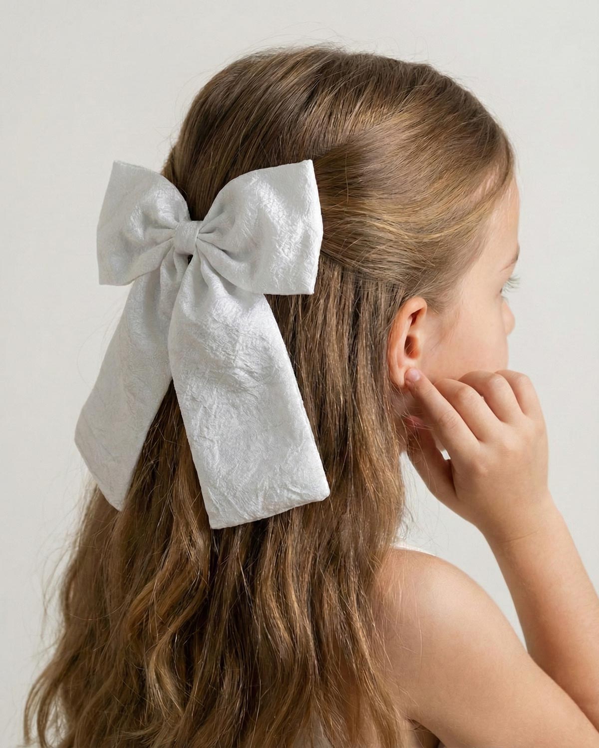 Con su textura luminosa y caída delicada, el moño se convierte en el accesorio ideal para darle ese detalle mágico a cada outfit. ¡Porque ningún look está completo sin su toque final de encanto! 🤍