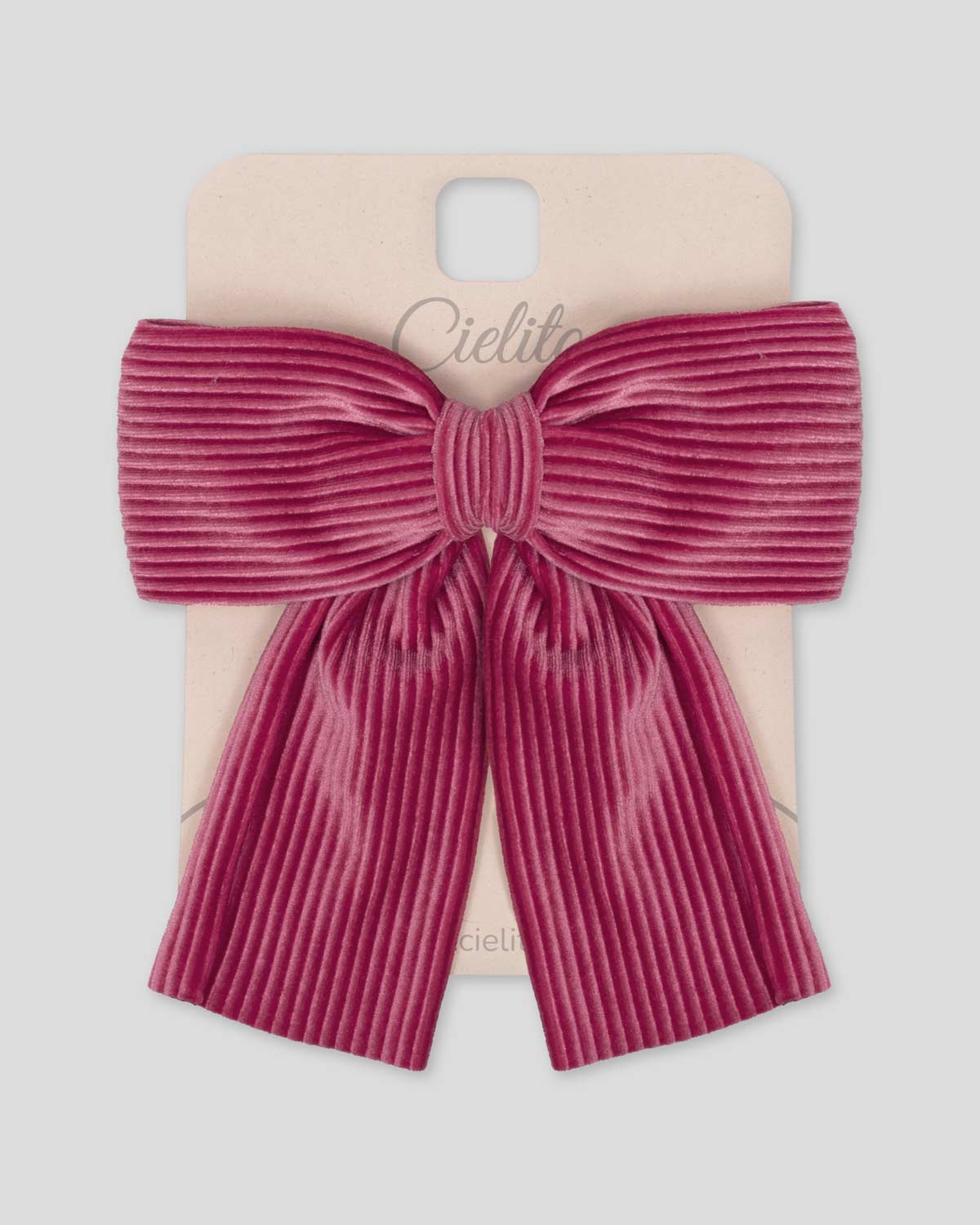 Moño pinza en tono rosa empolvado, con textura acanalada y caída suave que suma un toque romántico a cualquier look. Pequeño detalle, gran impacto.
