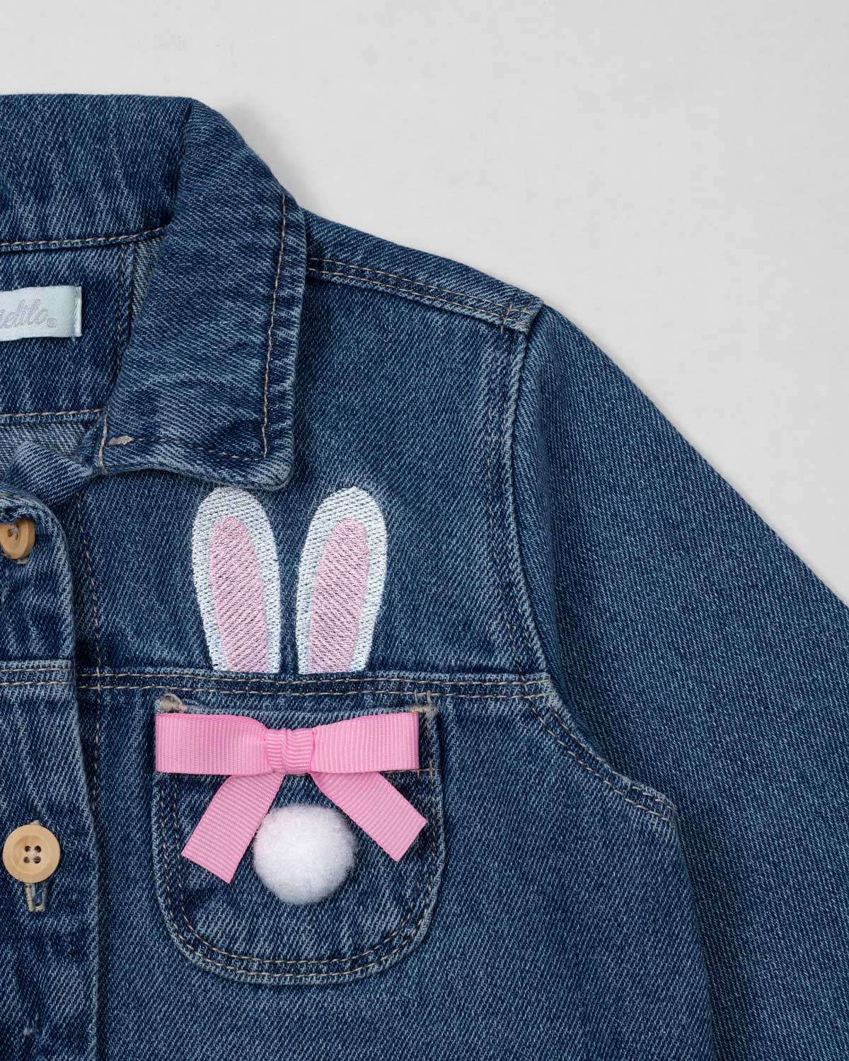 Chaqueta denim con bordado de conejo y moñito para bebé niña