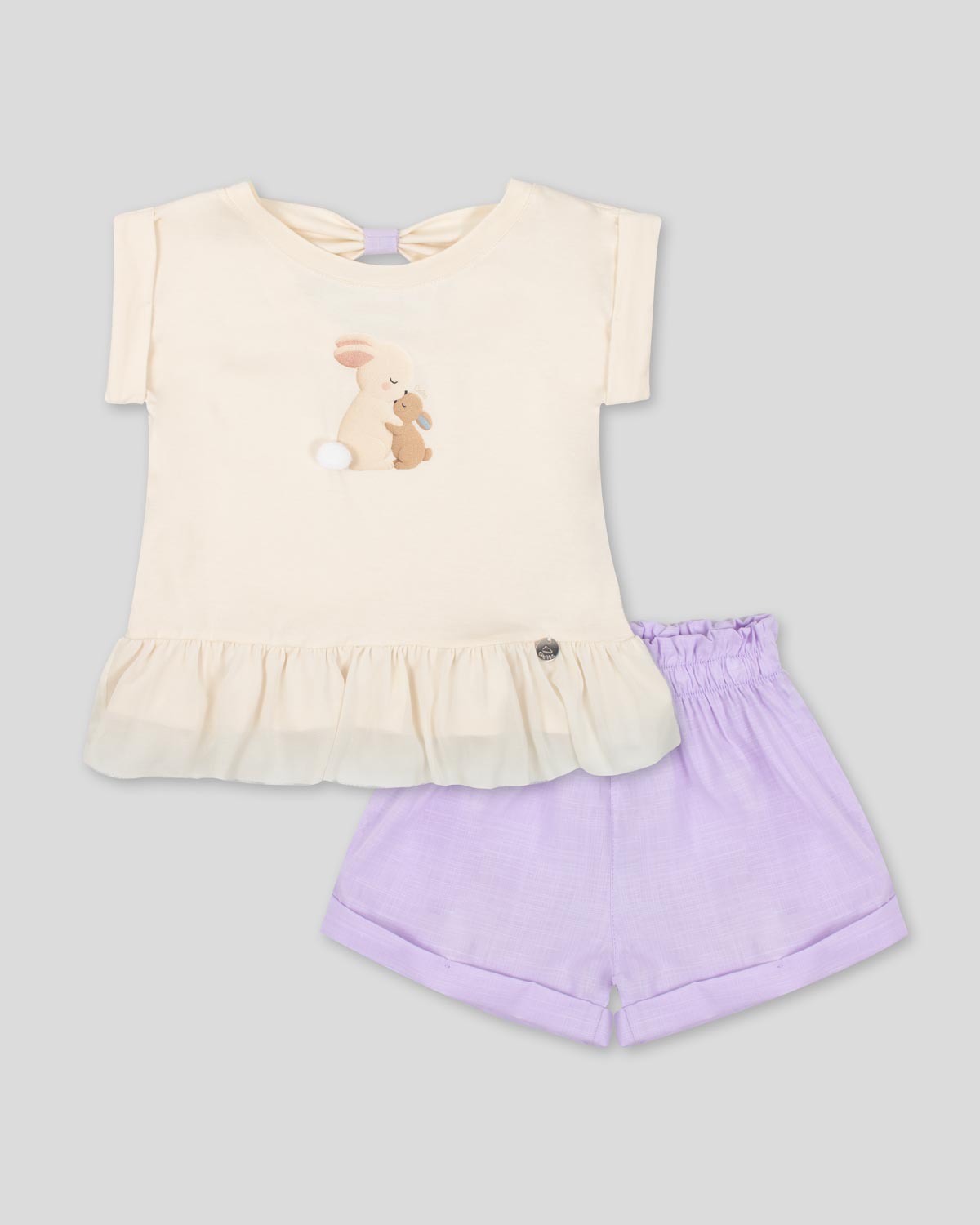 Conjunto blusa crema con estampado de conejitos y short lila para bebé niña