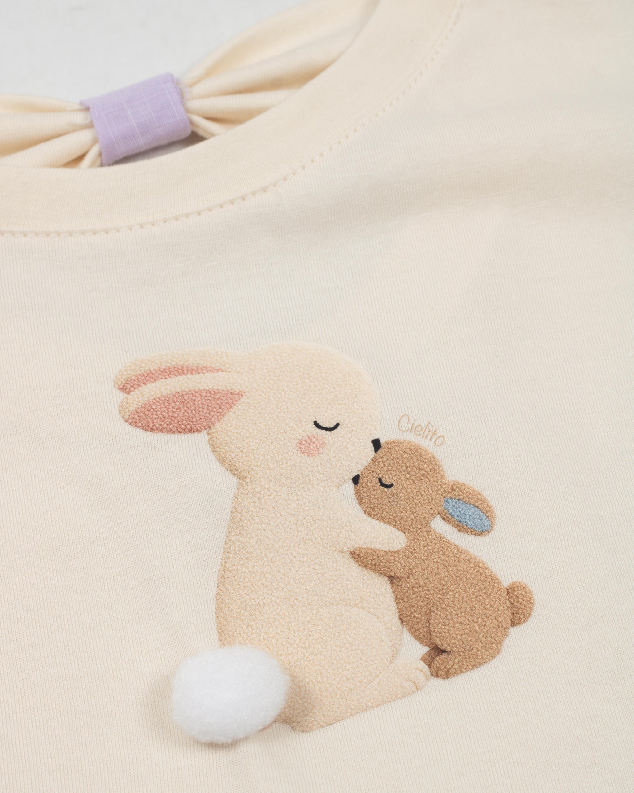 La camiseta en tono crema tiene un detalle de conejitos que transmite ternura de una forma sutil, y el volante en la parte inferior le da un toque precioso sin perder comodidad. El short lila es fresco, suave y ligero, perfecto para que tu bebé esté tranquila y se mueva con total libertad, sin apretar.