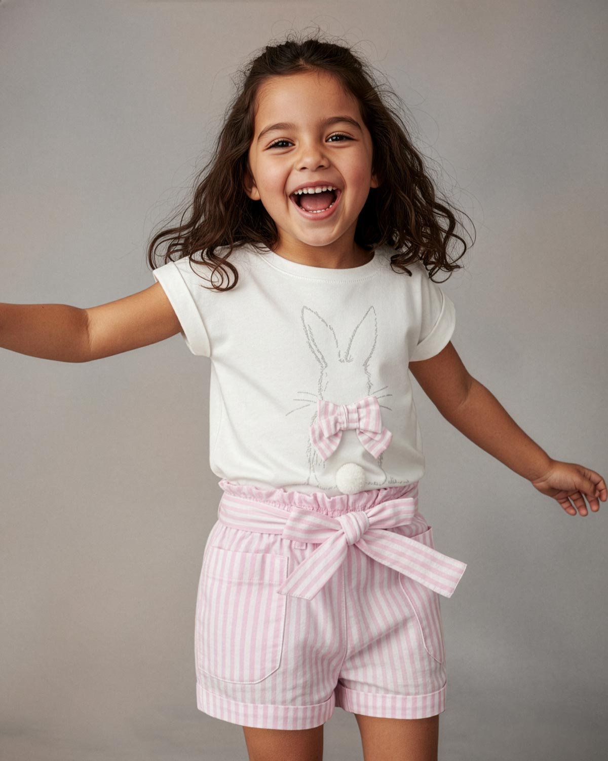 Conjunto blusa blanca de conejito y short de líneas rosas con cinturón para niña