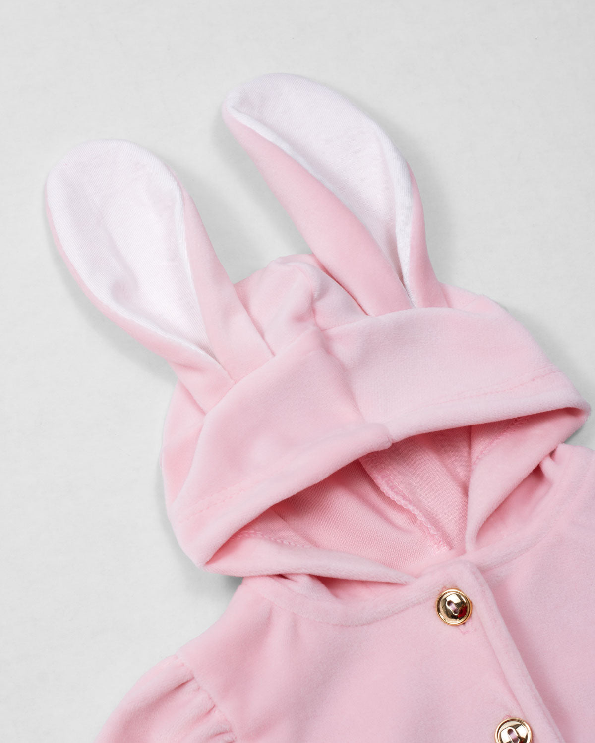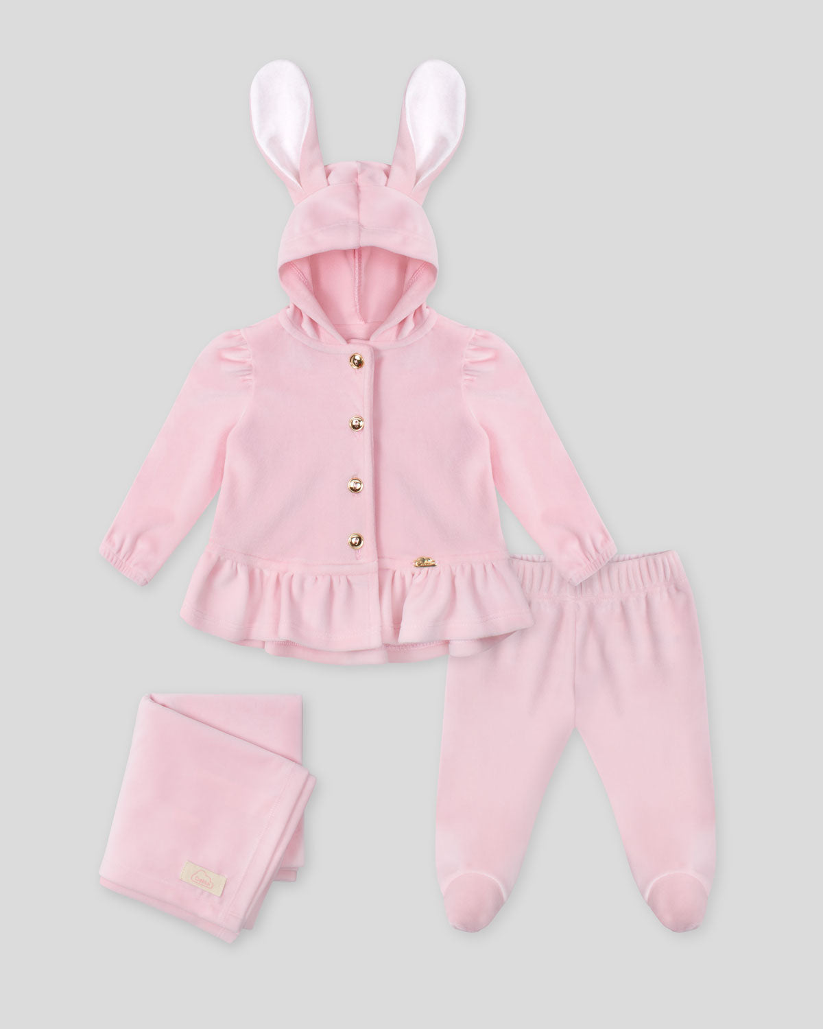 Ajuar rosa de dos piezas con orejitas de conejo y cobija para recién nacida