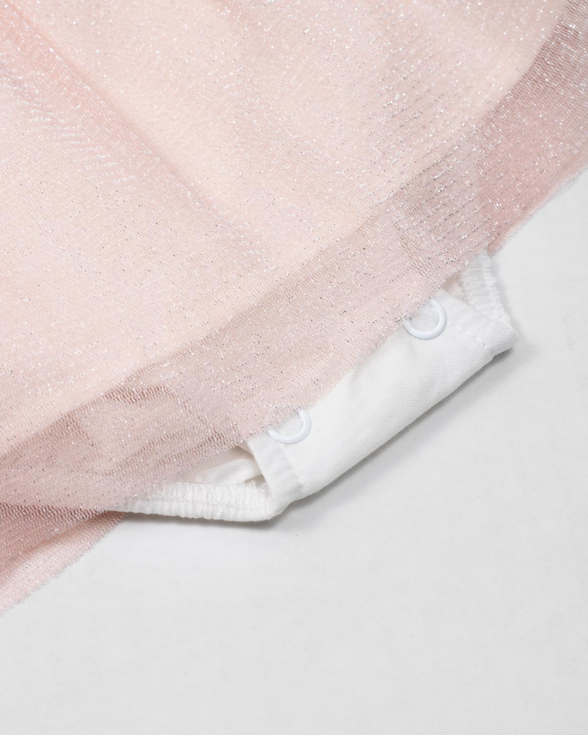Su parte superior con boleros se une a una falda rosa en tul con destellos sutiles, creando un contraste encantador. Una prenda especial para acompañar sus primeros momentos con ternura y brillo. ✨
