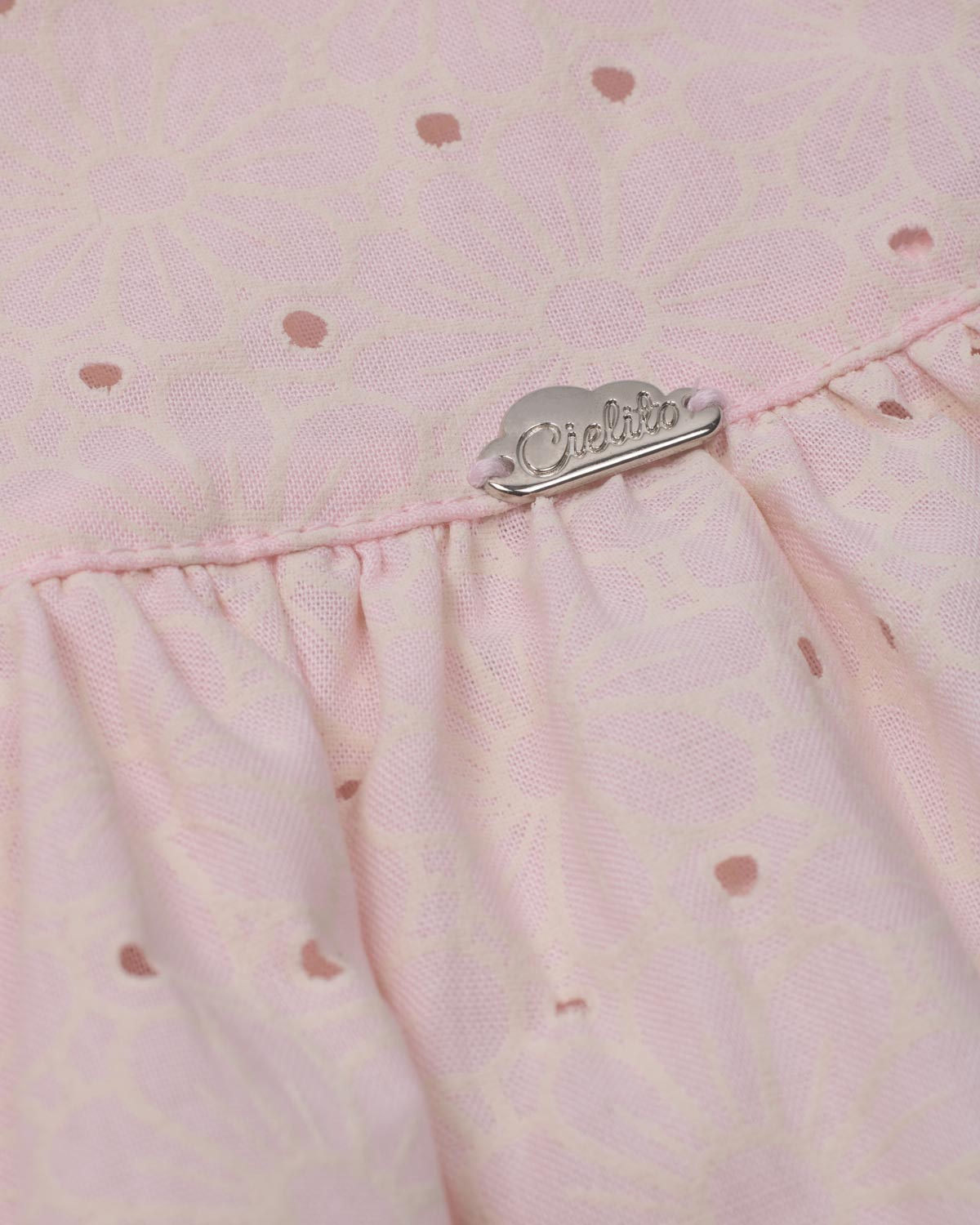 Vestido en tela hoja rota rosa con flores y moño para niña